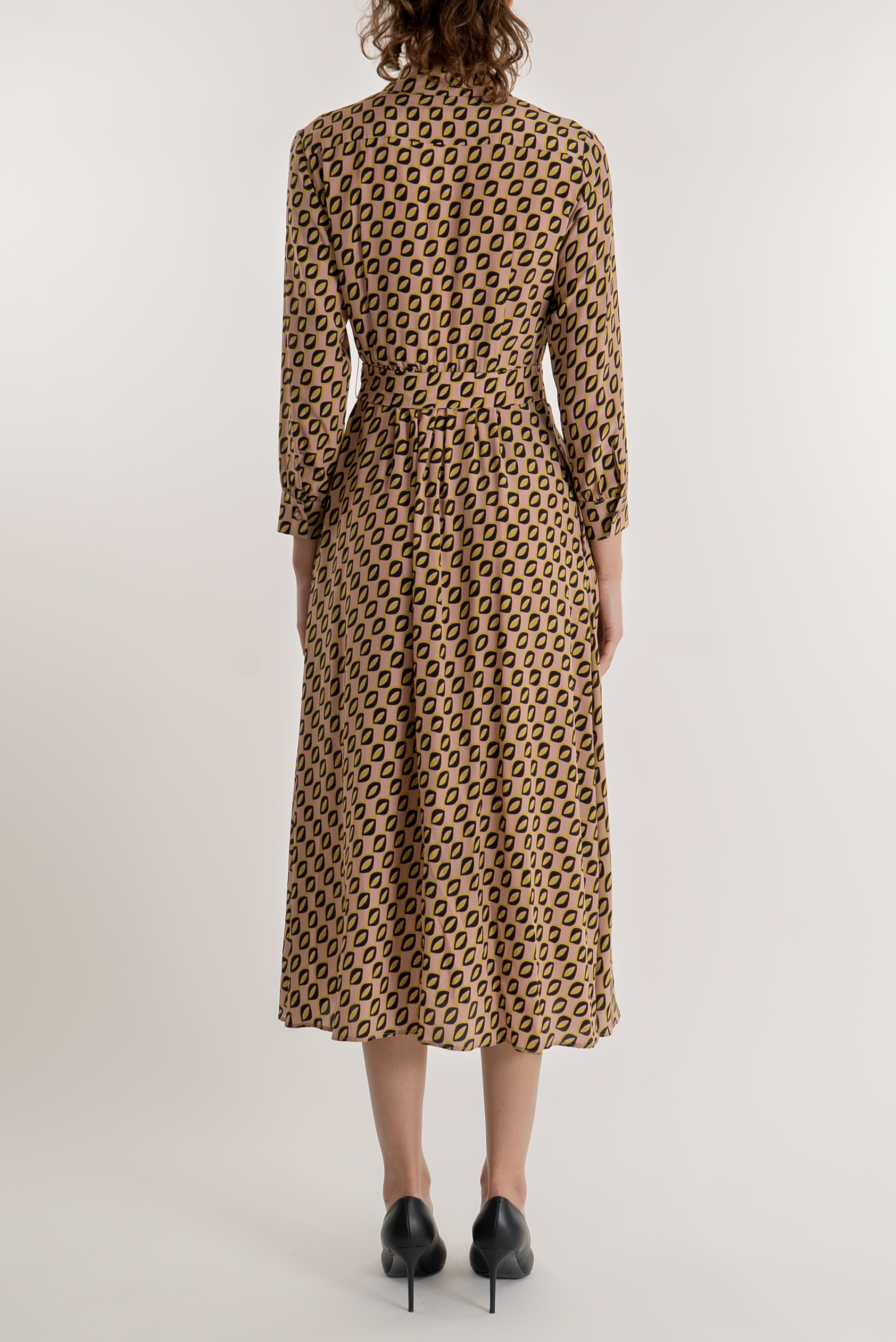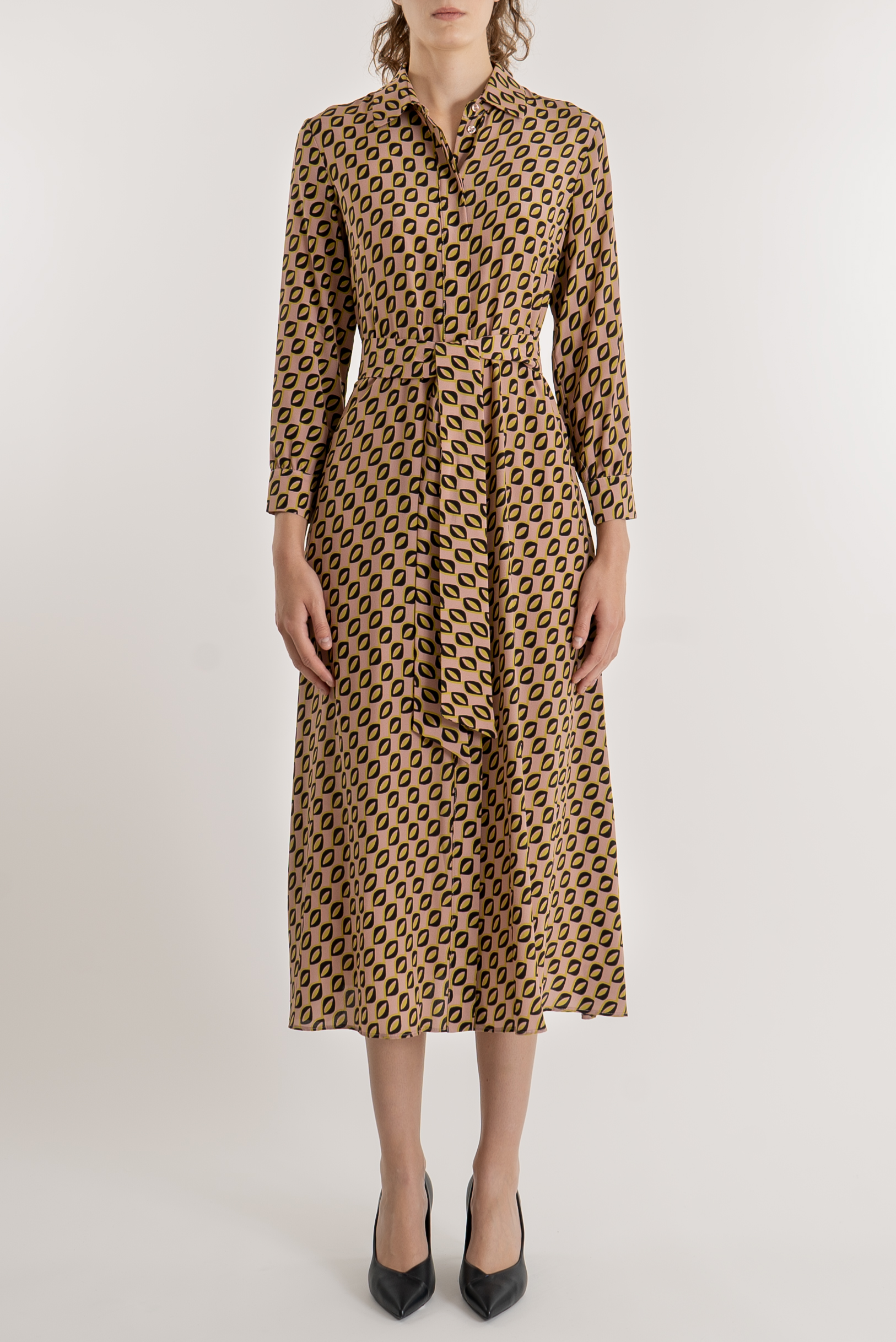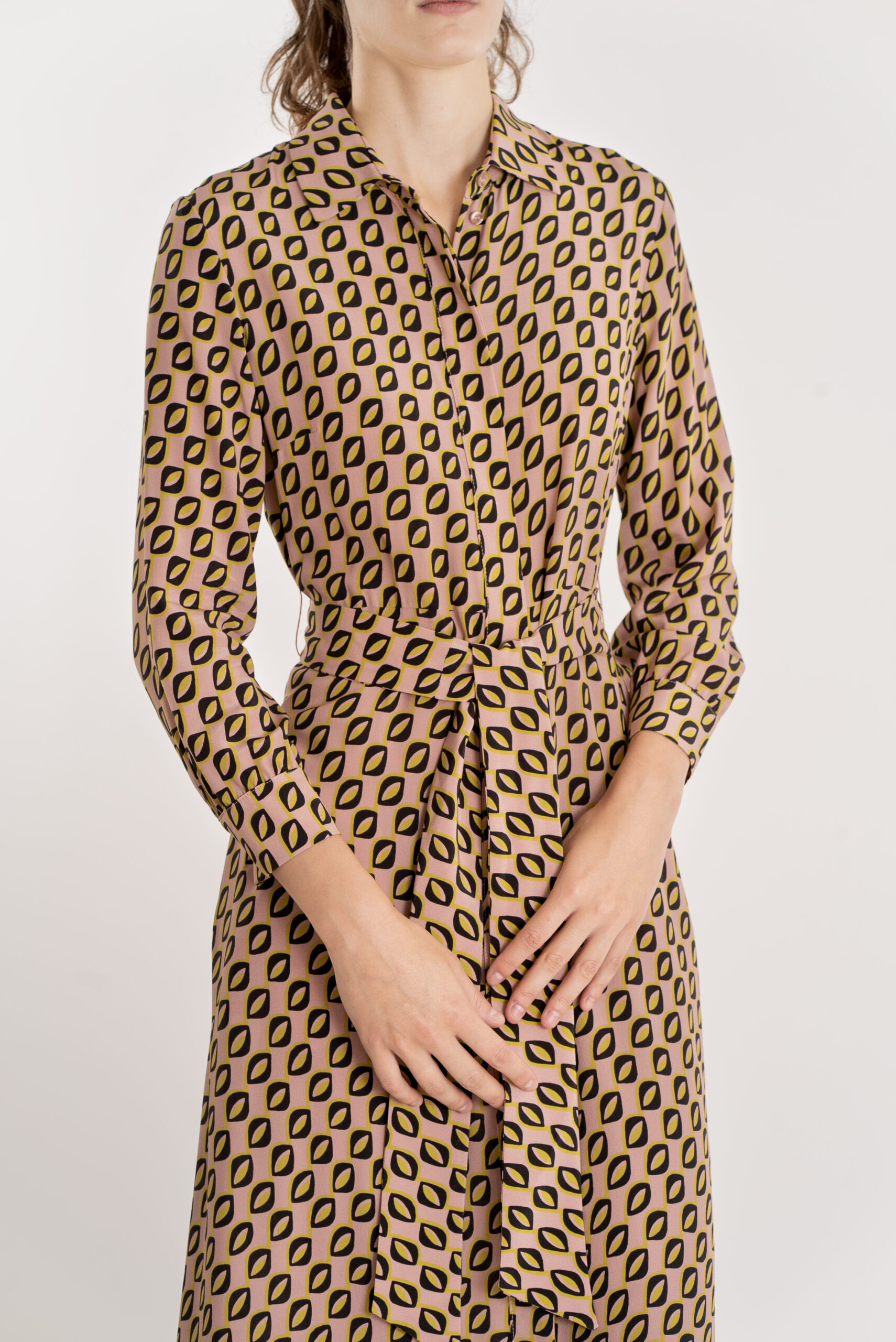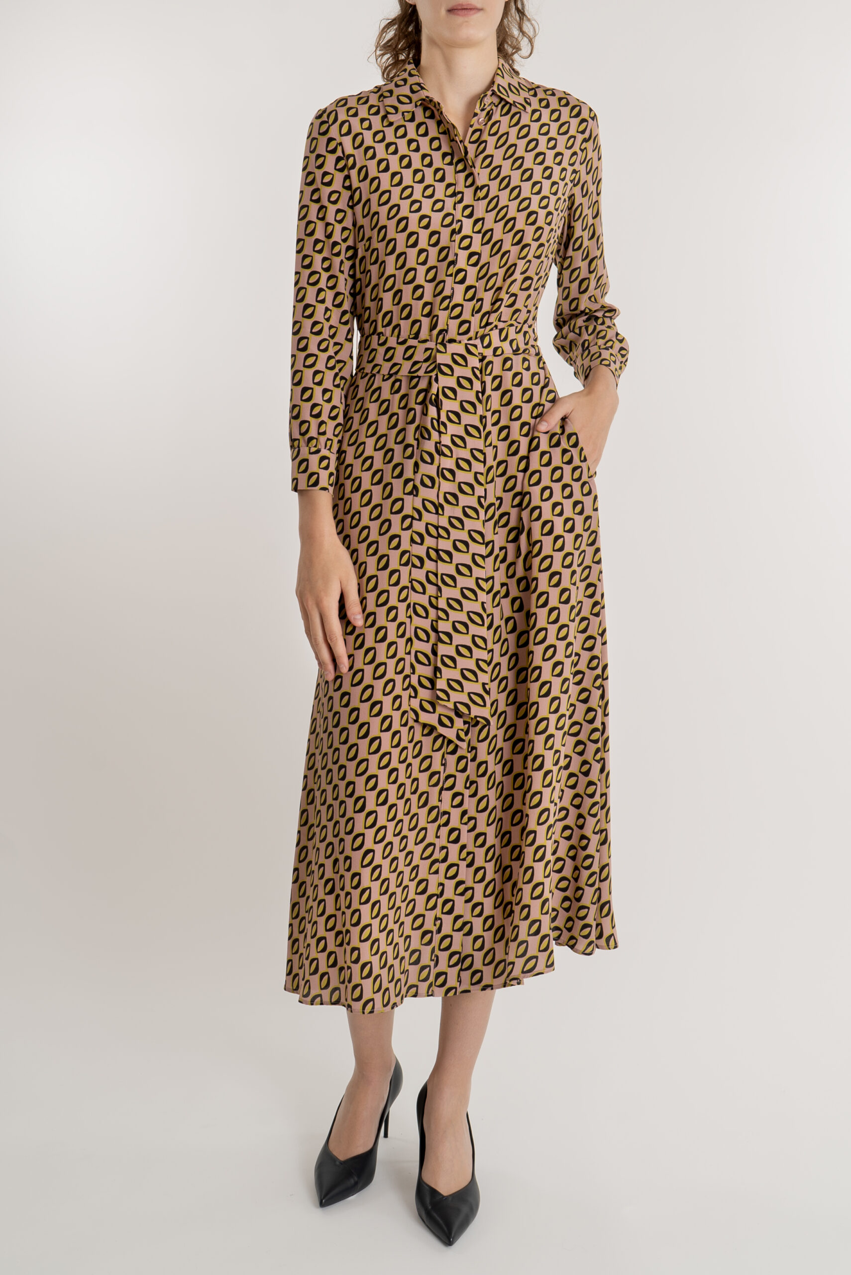 Abito lungo in twill di seta stampata, chiusura tramite bottoni sul davanti e cintura abbinata in vita.